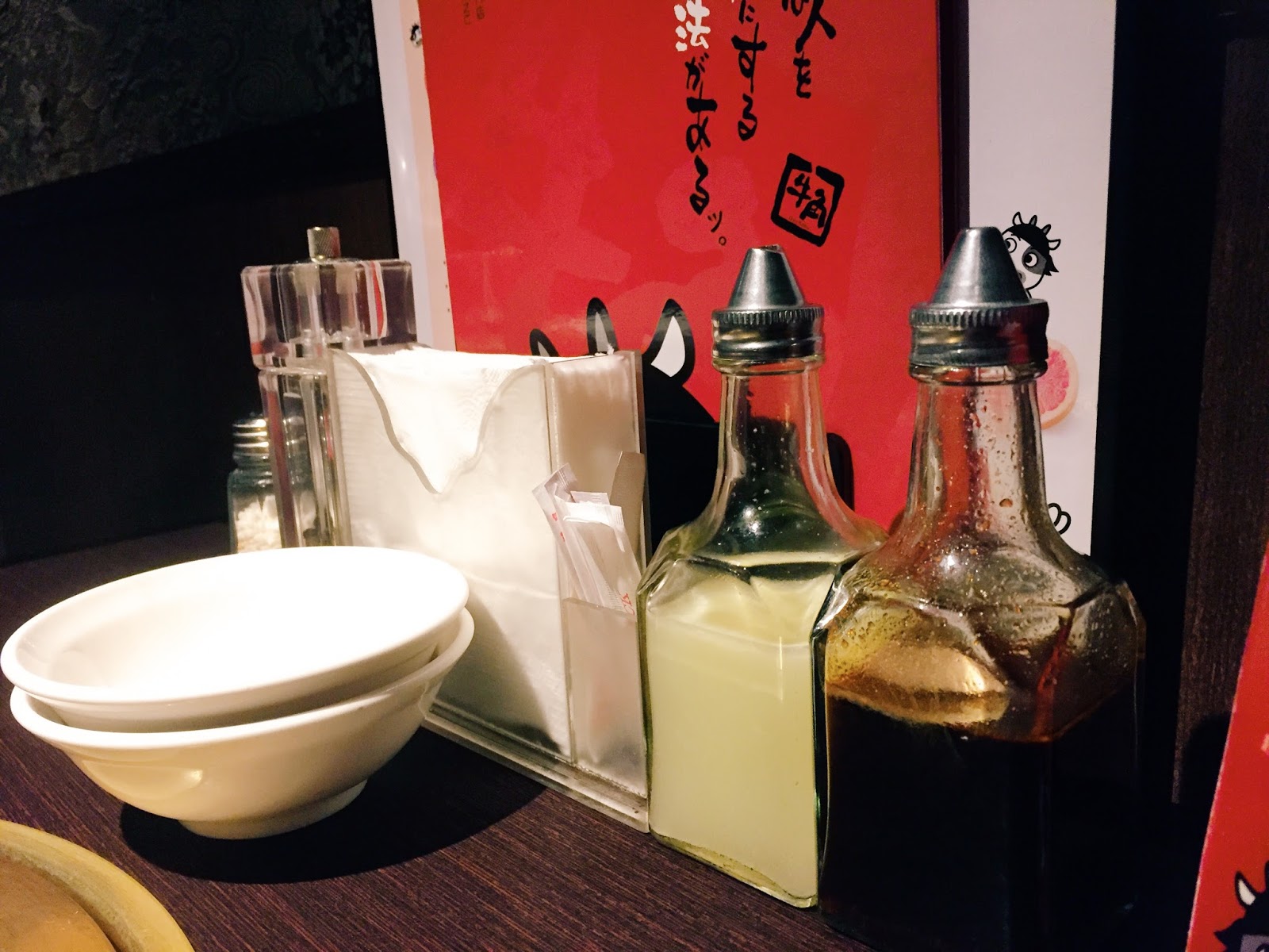 ▲ 旁邊是兩個小碗,以及鹽罐、面紙、醬料等等,似乎是和風醬及香柚醬